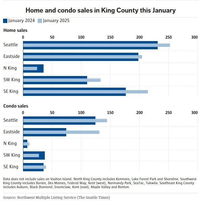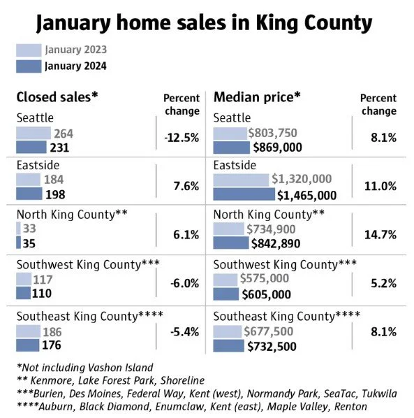 Seattle-area homebuyers made more deals in January than in December, a typical seasonal uptick, though sales remained lower than a year earlier, according to new data from the Northwest Multiple Listing Service. In King County, for example, pending sales shot up by 38% from December to January, but dipped 11% from January 2023. Sellers picked up their activity, too, offering more homes for sale. New listings more than doubled in King County from December to January, though they remain flat from a year ago.