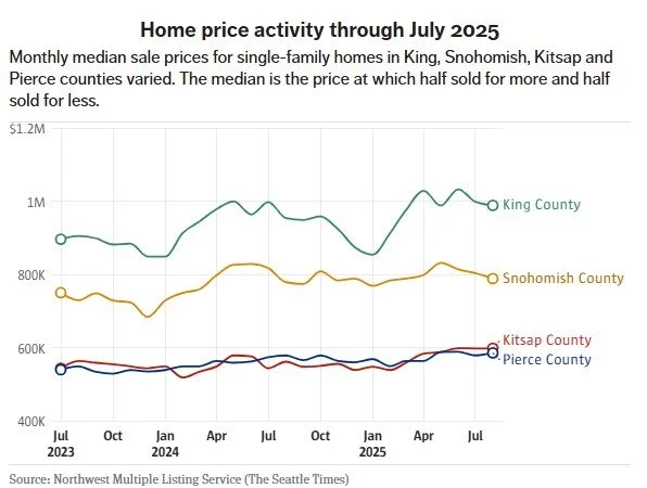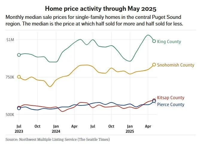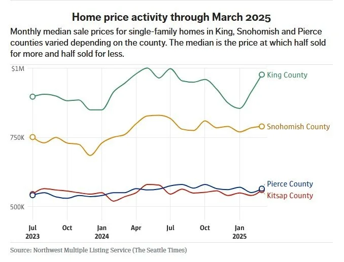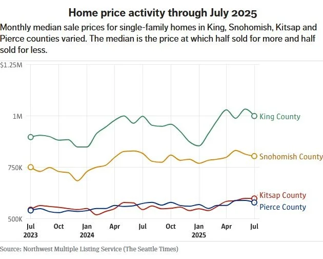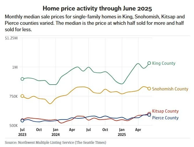 Elsewhere in the region, median single-family homes sold for $780,000 in Snohomish County, up 7% from a year earlier; $580,000 in Pierce County, up 5.5%; and $563,000 in Kitsap County, roughly in line with a year earlier.