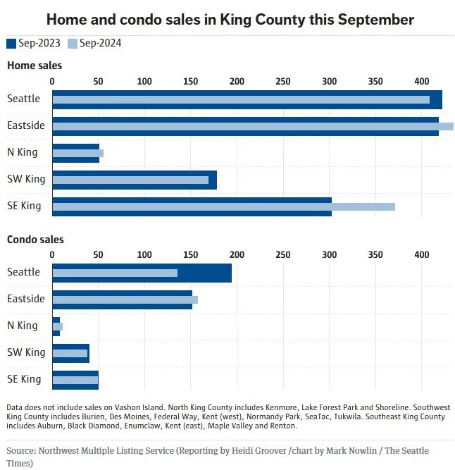 The median King County condo sold for about $559,000, up 8.5% from September 2023, driven by price hikes of 10% in Seattle and 11% on the Eastside. Seattle condo prices reflect both homes in apartmentlike multifamily buildings as well as small single-family-style homes constructed as accessory dwelling units and sold as condos.
