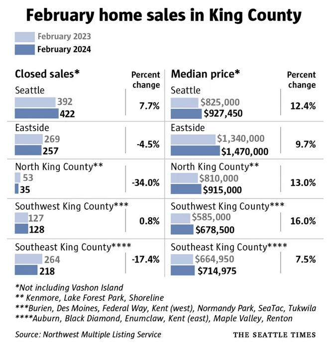 Median home prices ticked up 8% in King County from January to February. Pierce and Snohomish counties saw smaller 2%-3% upticks. The median King County home sold for $914,500 in February, up 14% from a year earlier. Median homes sold for about $751,000 in Snohomish County, up 9%; $550,000 in Pierce County, up 4%. More than half of King County's one-year price appreciation happened between January and February of this year. It's also worth noting that King County sellers listed nearly 1,850 single-family homes for sale last month, a 38% jump from January and 31% higher than the same time last year. Condo sales across all areas have also picked up.