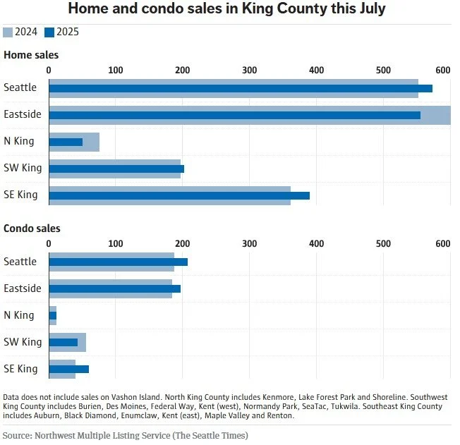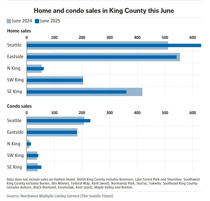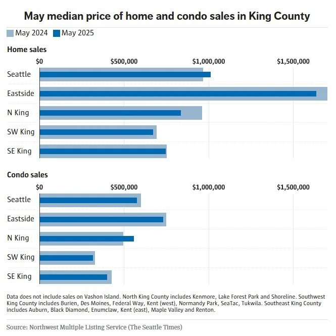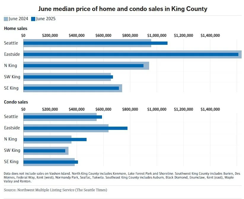 The local condo market is showing a bit less drama. King County condo prices ticked up 4% year over year, well below the price jump for single-family homes. Median condos sold for $559,000 in Seattle, up 2%, and $627,500 on the Eastside, up 5%.