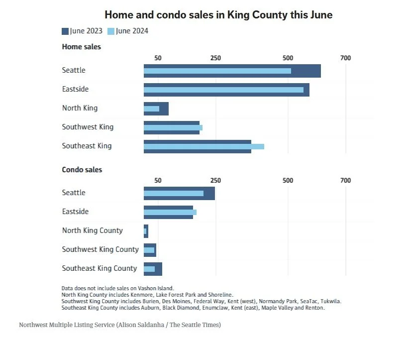 The median single-family home in King County sold for $965,000 in June, down from a month earlier and about 3% higher than a year ago, according to new data the Northwest Multiple Listing Service released Wednesday. Condo prices are following a similar trend: The median King County condo sold for about $555,000 last month, down from May but up 5% from a year earlier.