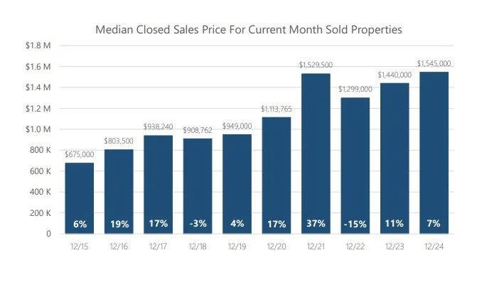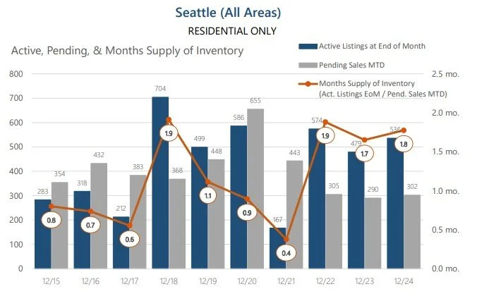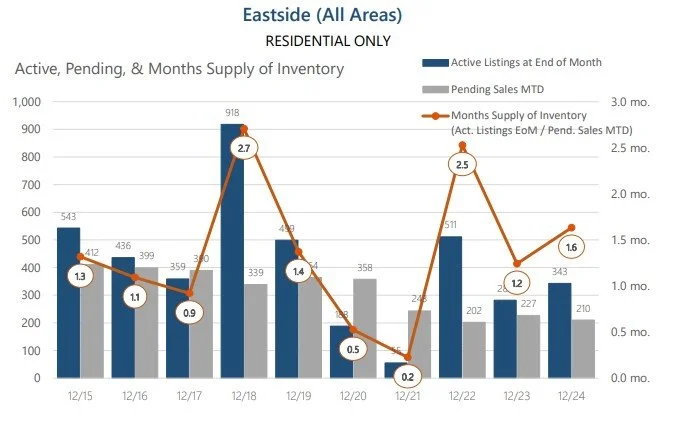 Based on the December data released by NWMLS, the Eastside had 1.6 months supply of inventory, which was the third-highest in the past decade, signaling a seasonal slow down during the holidays and perhaps a market shift. However, 29% of December closings sold at above their original listing prices. The median home price of $1,545,000 was 7% higher than the same period of 2023. In Seattle, December had 1.8 months of inventory. The median home price was $898,900 which was 6% higher than the previous year. At the end of this paragrph, you will see the 10-year trends of inventory levels and median prices of the Eastside and Seattle. If you are interested in the same data of King and Snohomish counties, please let me know.