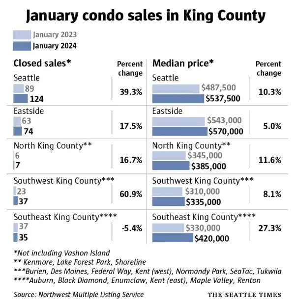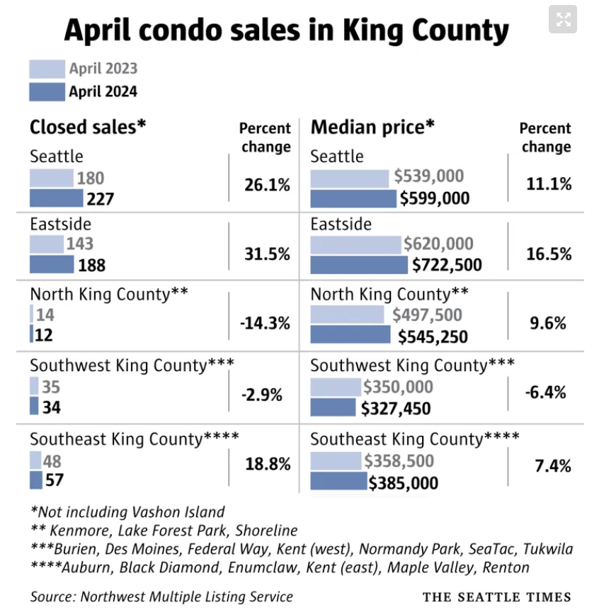 King County condo prices have surged. The median Seattle condo sold for $689,975, up 28% from a year earlier. The median Eastside condo sold for $734,900, up 29% annually. Seattle condos include apartmentlike homes in multifamily buildings and detached accessory dwelling units that resemble small single-family homes and are typically more expensive than other condos.