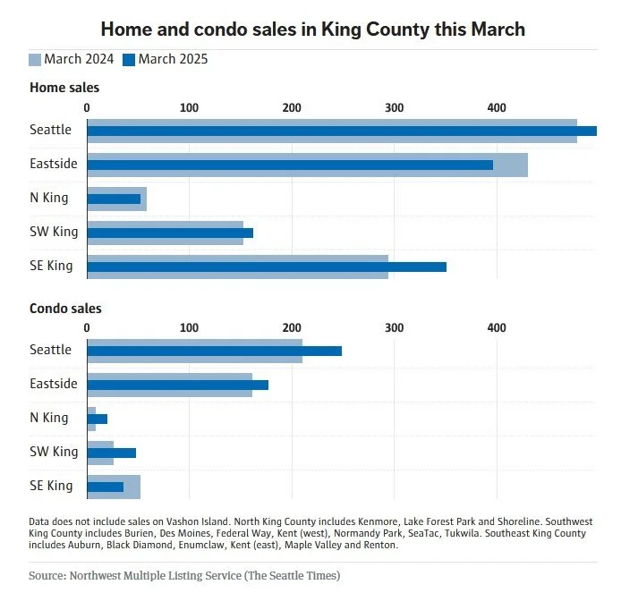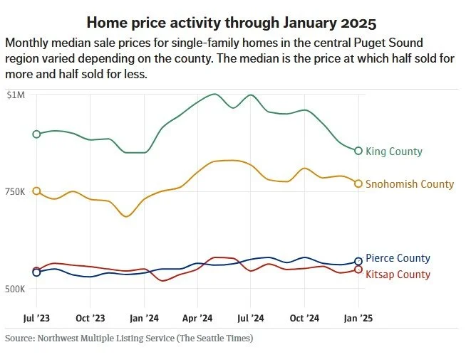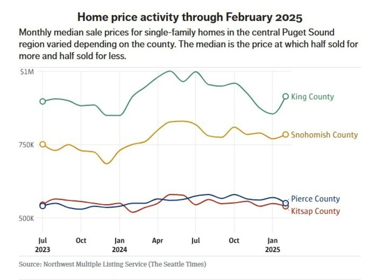 The national economy remains a wild card for the housing market this spring. Consumer confidence has plummeted on the news of a potential global trade war over tariffs. Some national economists have raised the odds of a recession. a recession and job declines could set the Seattle-area market back for a repeat of a weak 2023 market. But mortgage rates tend to drop during economic downturns, and that could also spur demand for homes among those who retain their jobs.