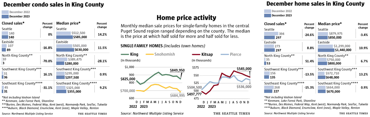 Median home prices dipped from November to December across the region, but remained higher than they were a year earlier in most Seattle-area counties. Median home prices in December hit about $850,000 in King County, up 3% from December 2022; $536,000 in Pierce County, up 6%; $545,000 in Kitsap County, up 9.5%, and $685,000 in Snohomish County, down 2%.