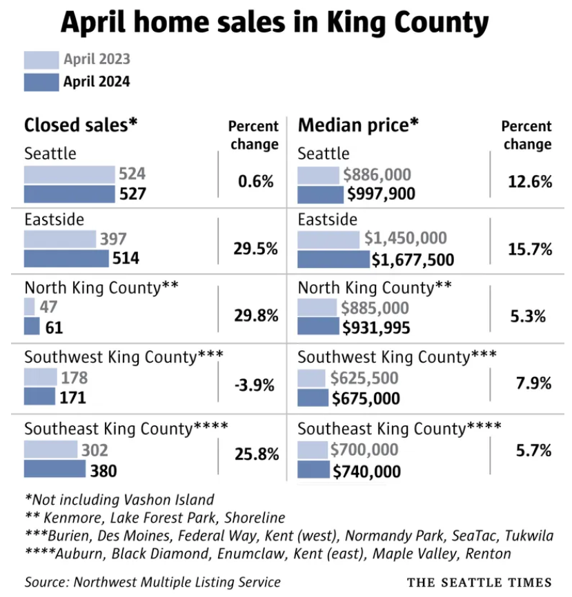 The median single-family home sold for $980,000 in King County in April, up 12% from April 2023. Median homes sold for $799,500 in Snohomish County, up 4% from a year earlier; $565,000 in Pierce County, up 8%; and $550,000 in Kitsap County, up 6%. Median means half sold for more and half for less. The median price of single family homes on the Eastside went up by 15.7%, while condos on the Eastside climbed by 16.5%.