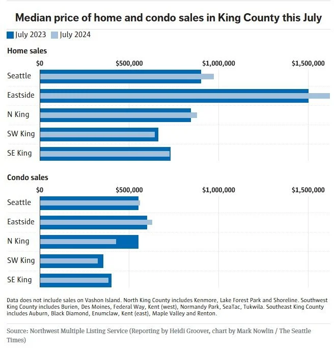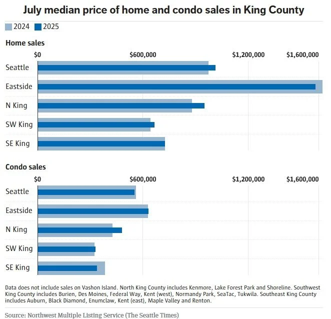 In July, the median home price in Seattle rose by almost 4% to $1.01 million, while falling on the Eastside by about 2.5% to $1.58 million.