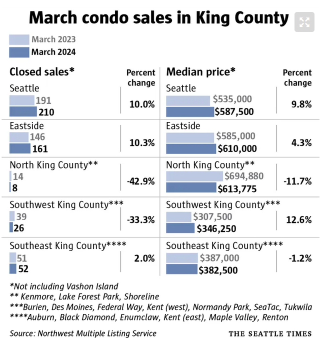 Across the region, condo prices also climbed. In King County, the median condo price in March was $590,000, up 9% from last year. In Snohomish, the median condo price increased 2.9% to $529,994 and in Pierce it was up 6.7% to $415,000. The condo data includes units in condo buildings and some accessory dwelling units that resemble small single-family homes. In Seattle, the median condo price was $627,650, up 6.8% from last March.