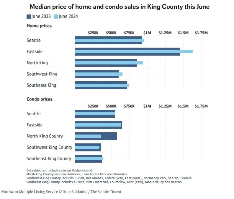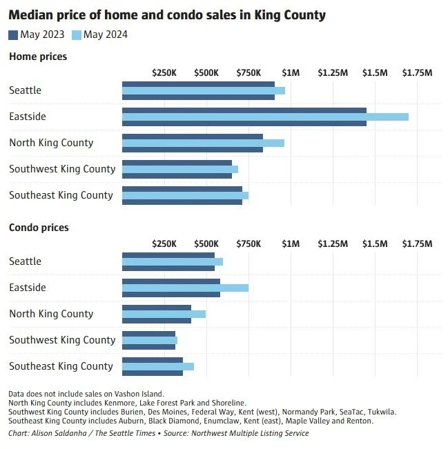 The median Seattle home sold for $925,000, up 6% year-over-year, and the median home on the Eastside sold for $1.7 million, up 19%. Home prices also climbed about 7% in South King County and 11% in North King County.