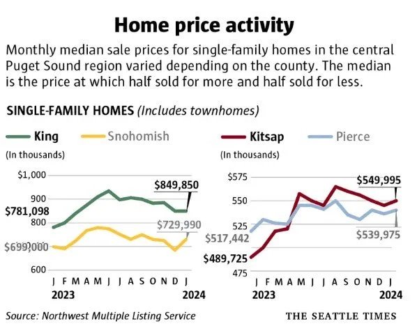 Median home prices were flat across much of the Puget Sound region from December to January and remain higher than a year ago. The median single-family home sold for about $850,000 in King County, up 9% from January 2023. Median homes sold for about $730,000 in Snohomish County, up 4%; $540,000 in Pierce County, up 4%; and $550,000 in Kitsap County, up 12%. (Home prices reflect sales closed in January, which likely took place in December.)