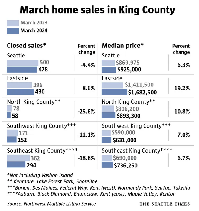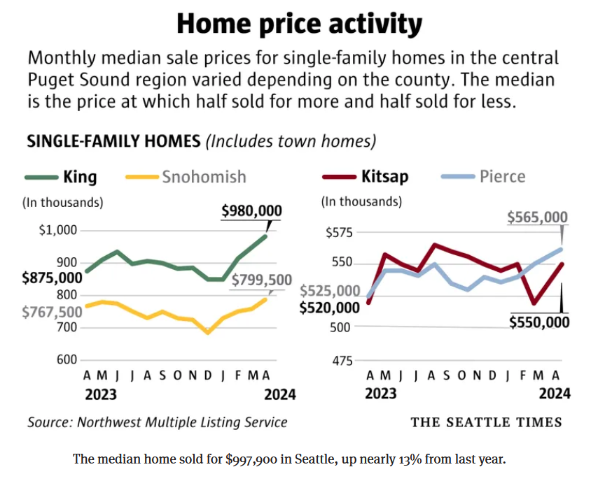 n King County, the median sale price in March was $945,500, 13% higher than in March 2023. The median single-family home sold for $760,000 in Snohomish County, up 5% from a year ago; $550,000 in Pierce County, up 5%; and about $535,000 in Kitsap County, up 3%.