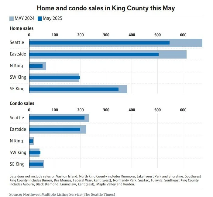 Sellers listed more homes for sale in May than during the same period last year, according to the multiple listing service. That was especially true in King County, where new listings of single-family homes were up 33% and new listings of condos increased 38%.