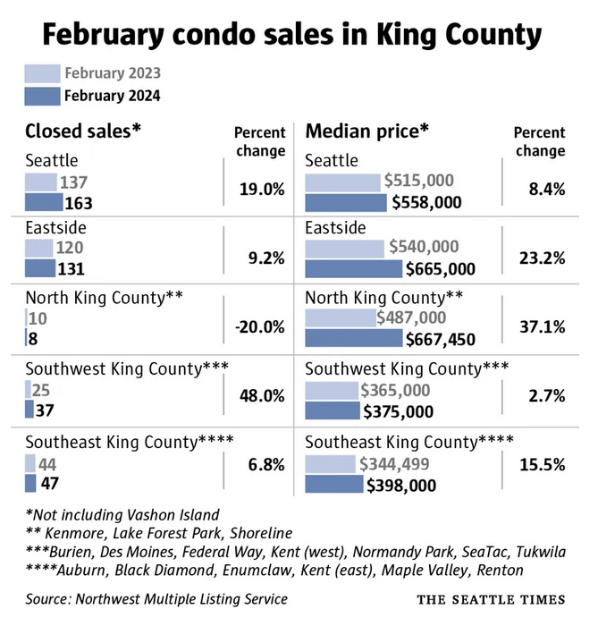 Condos continued to increase in price after a surge in January. The median Seattle condo price was $625,000, up 12% from a year earlier. The median Eastside condo price was $787,475, up 18%.